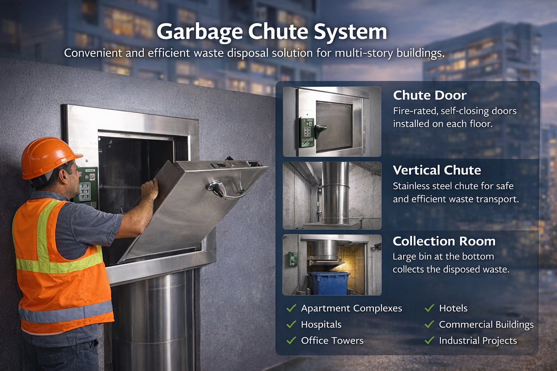 A Garbage Chute is a vertical pipe system installed in multi-storey buildings for easy and safe waste disposal. Residents or staff can throw garbage into the chute door on each floor, and the waste directly goes down to a collection bin at the ground level.
